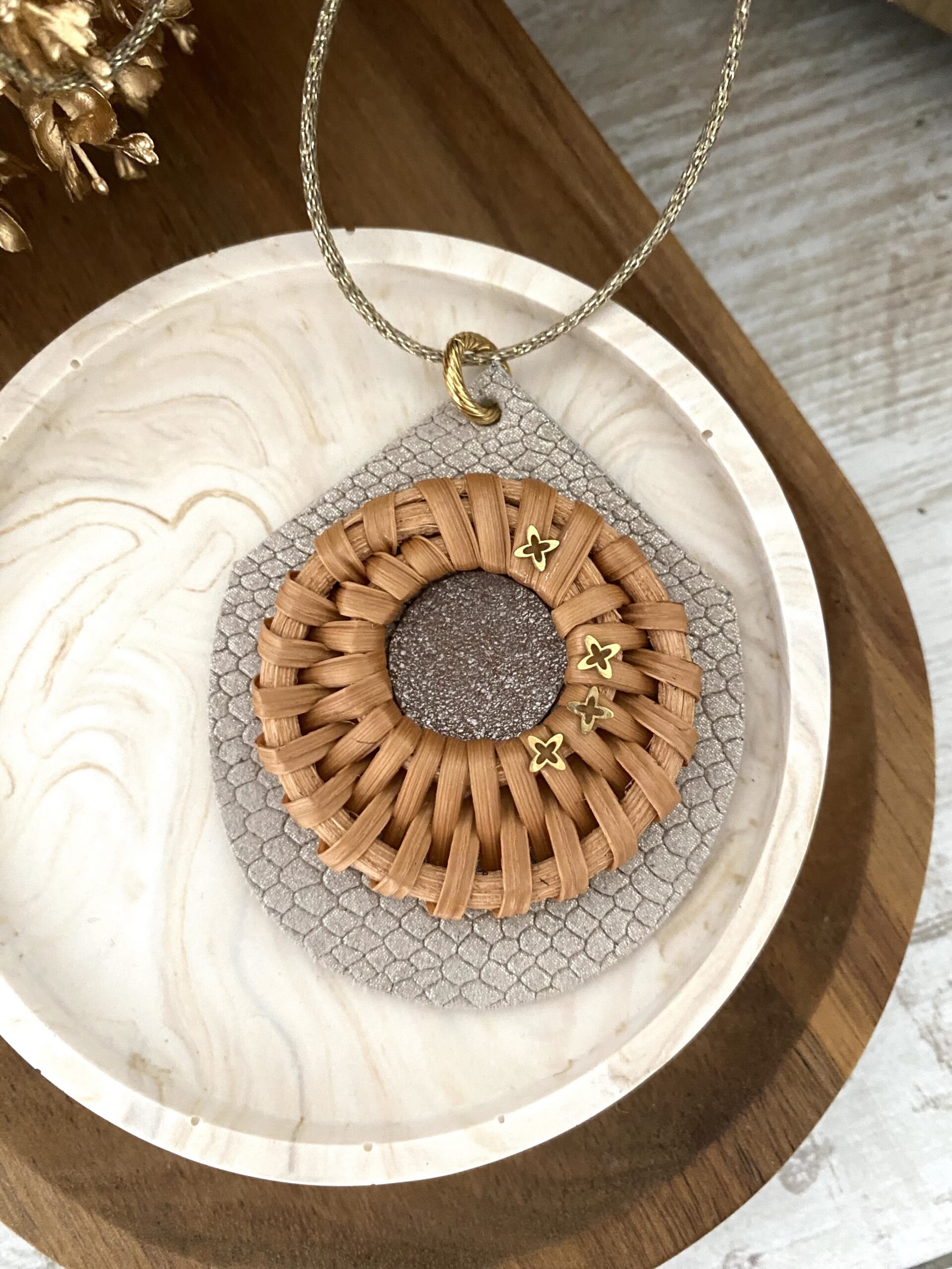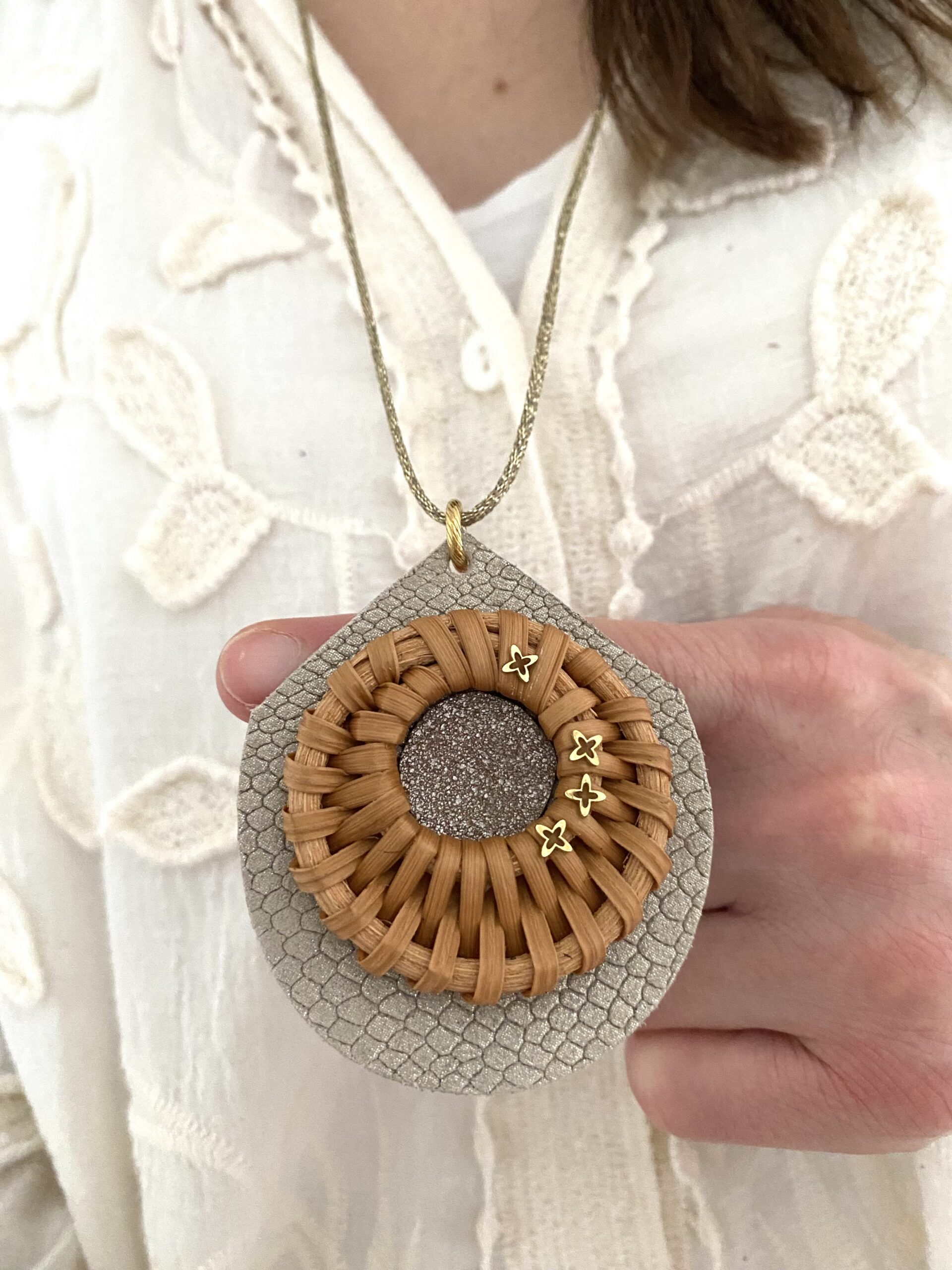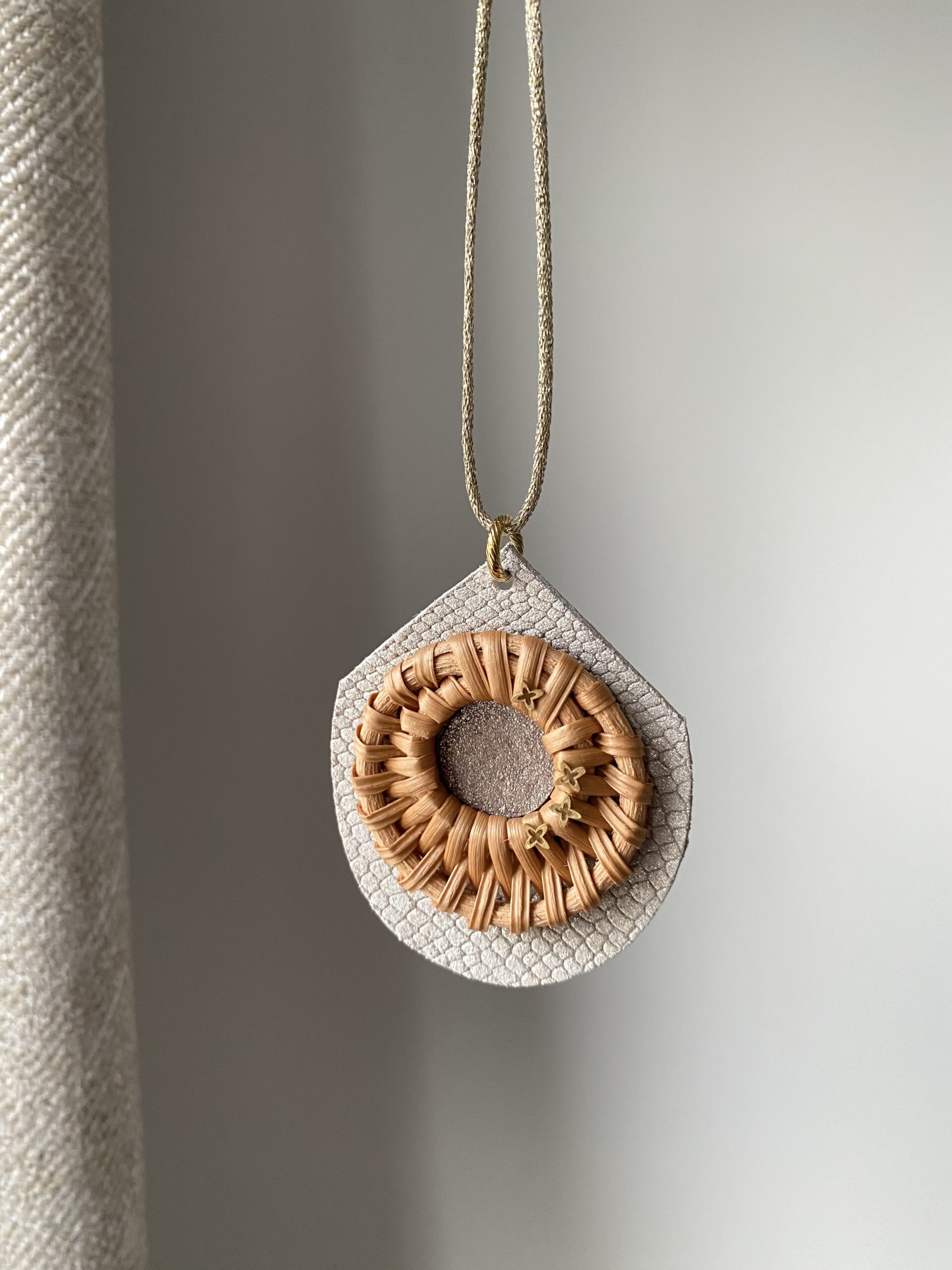 Un sautoir entièrement confectionné à la main, fait de rotin, de cuir recyclé* et d’acier inoxydable doré, monté sur un cordon métallisé.