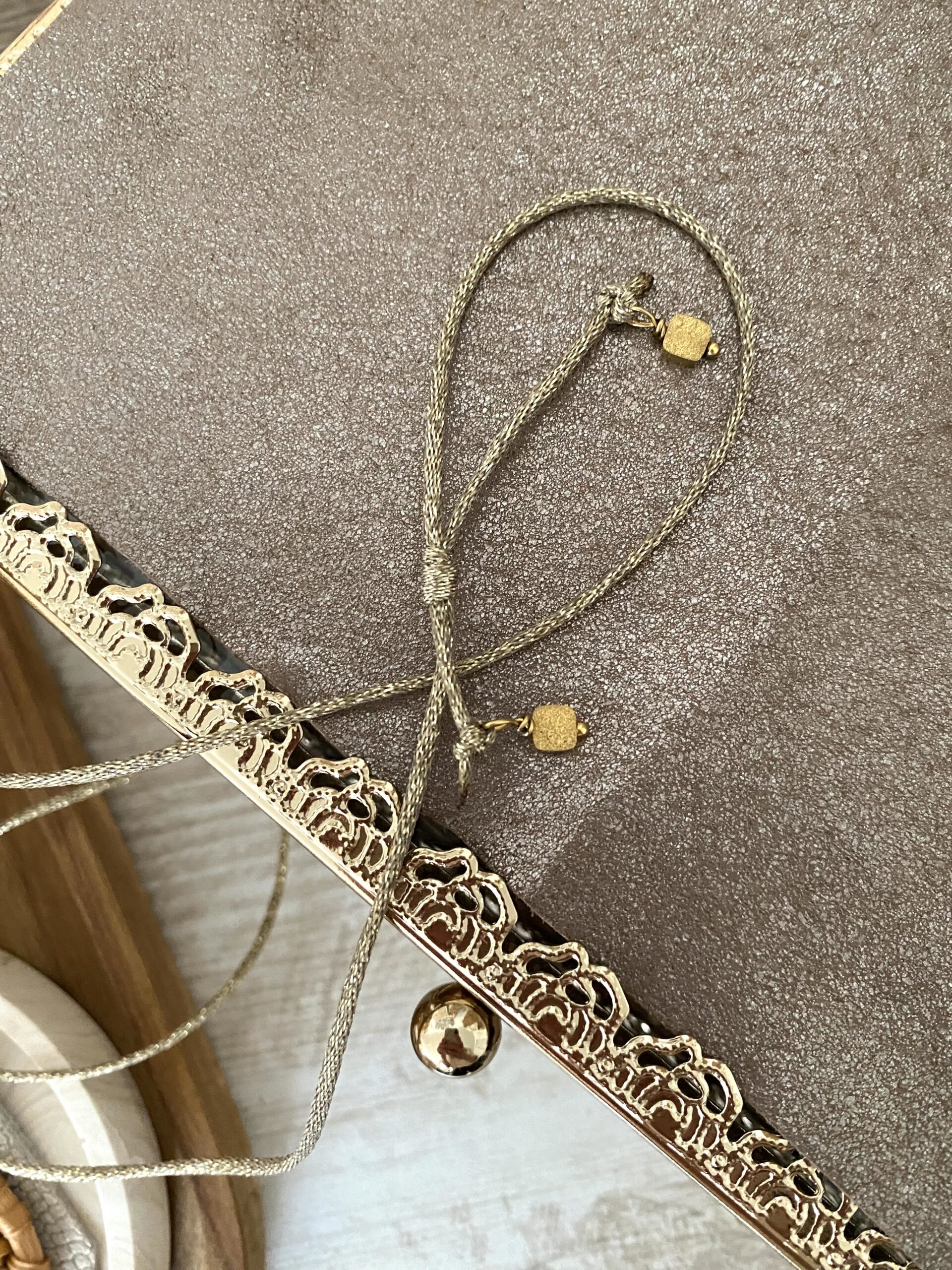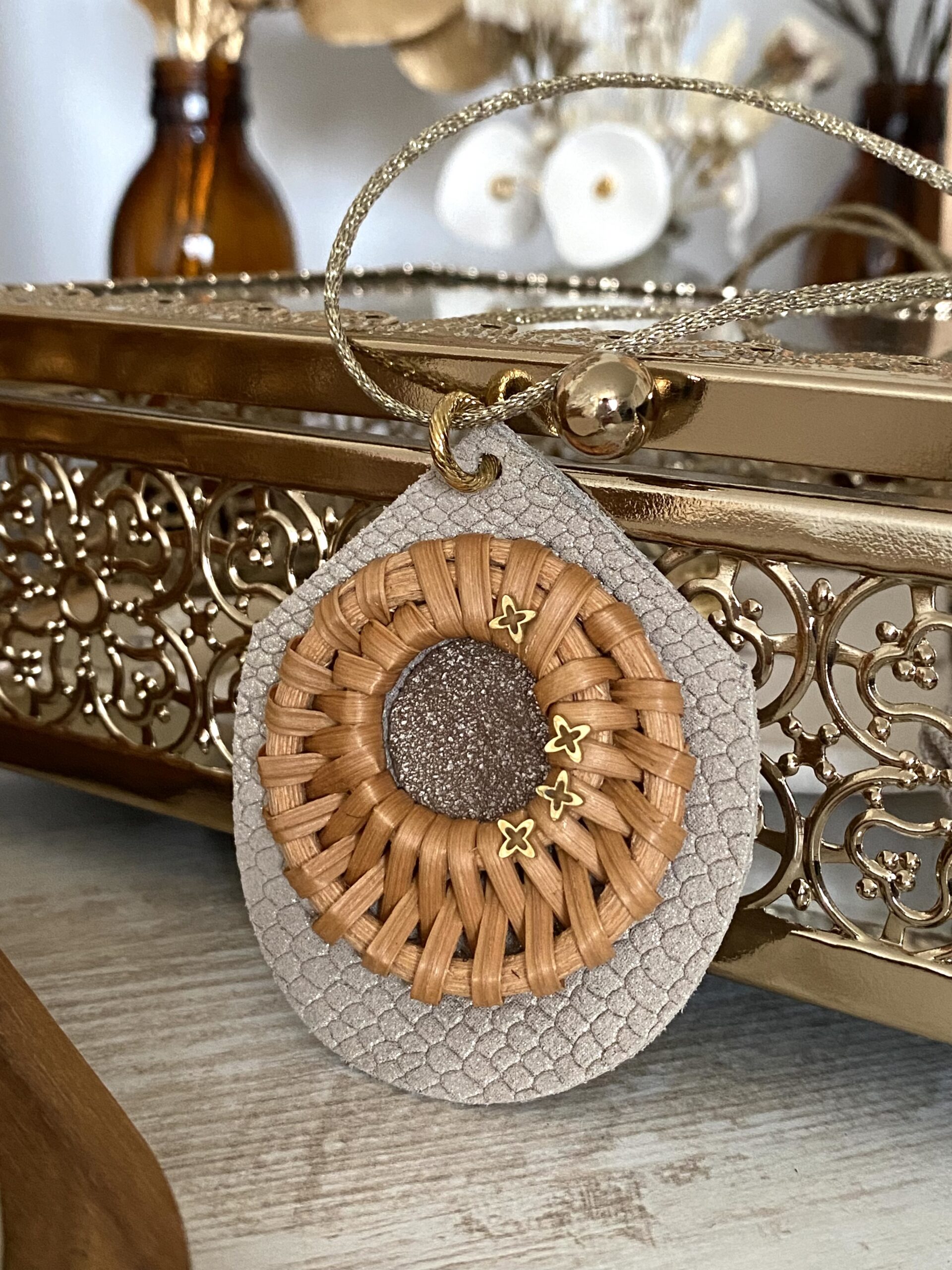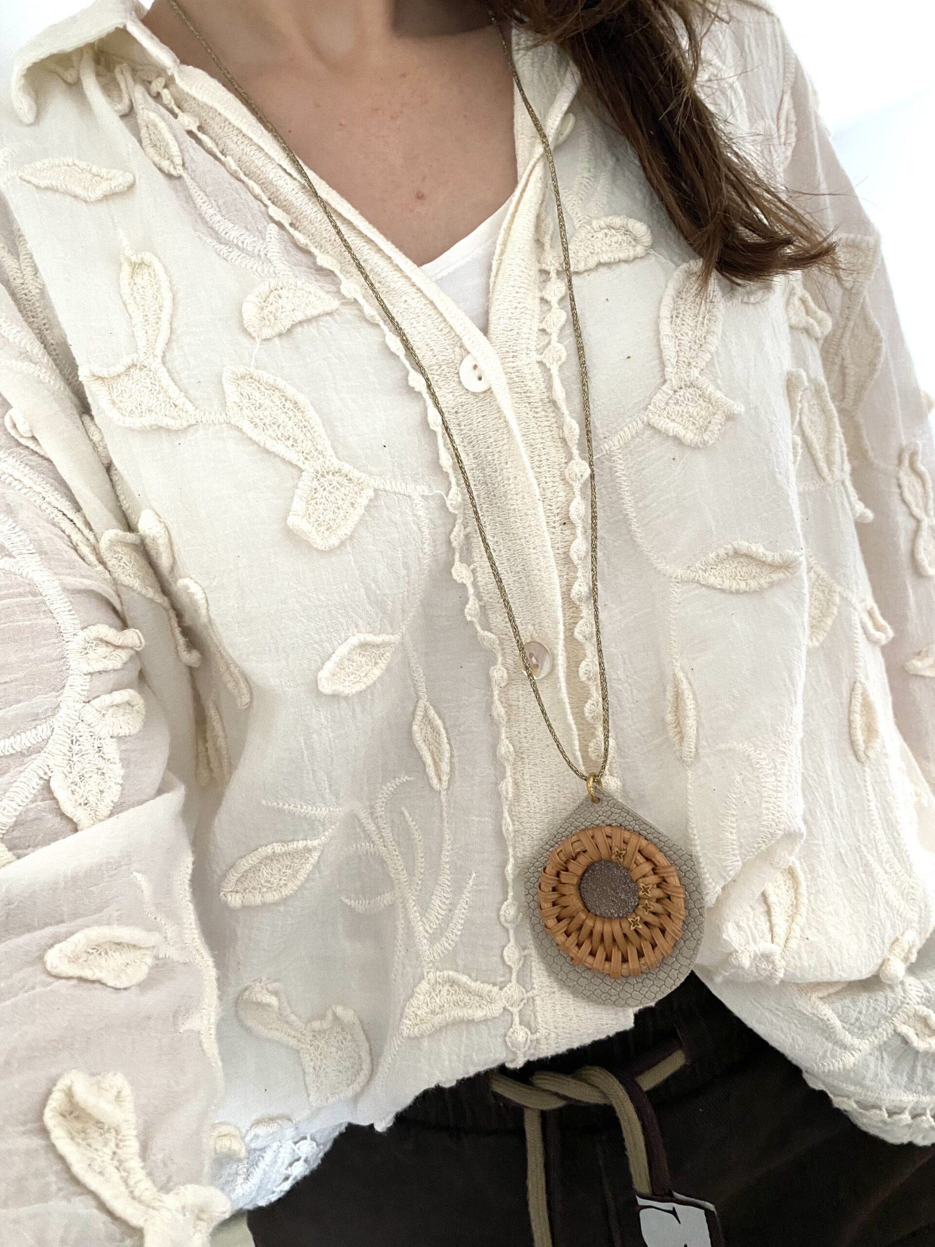 Un sautoir entièrement confectionné à la main, fait de rotin, de cuir recyclé* et d’acier inoxydable doré, monté sur un cordon métallisé.