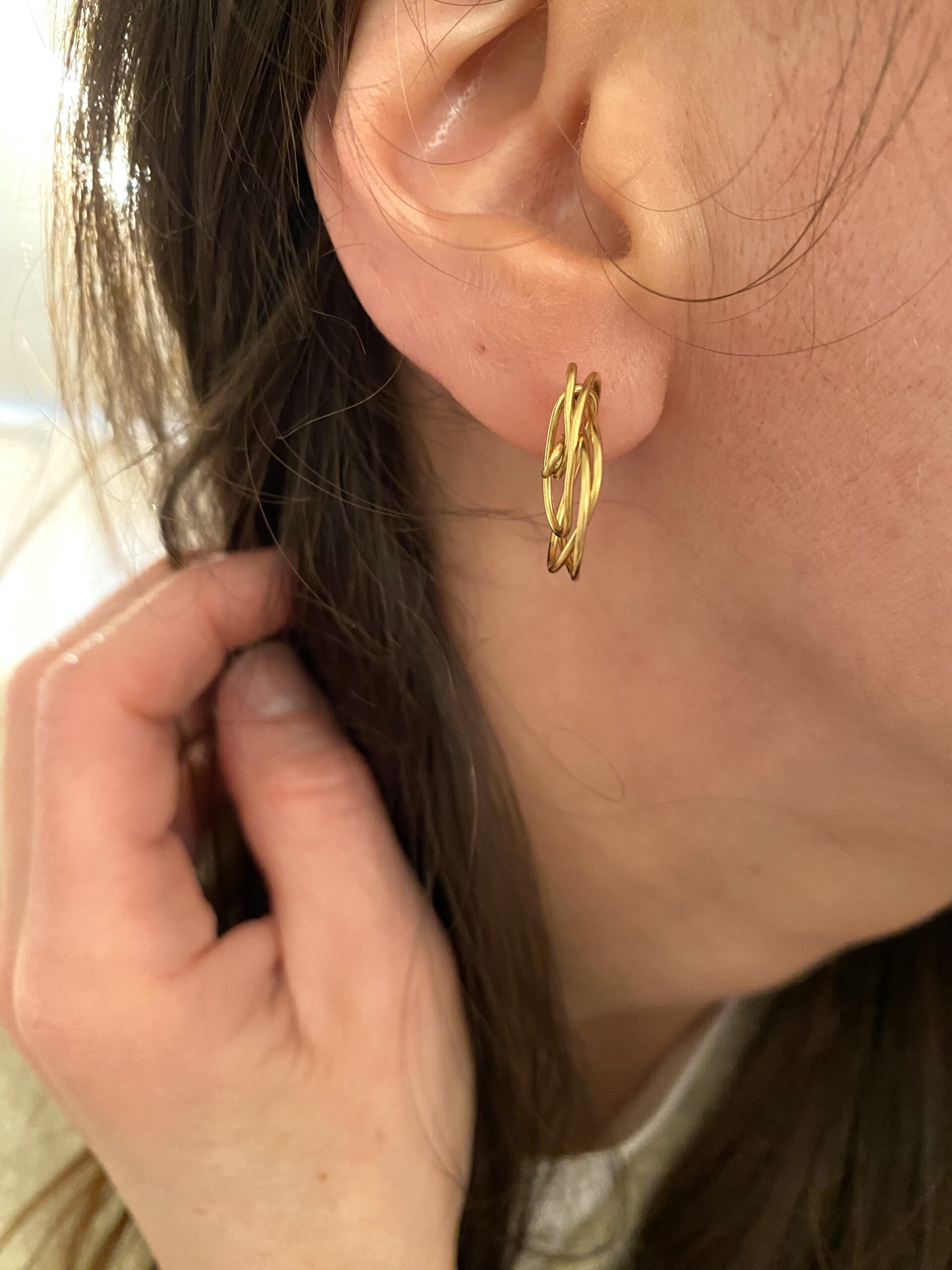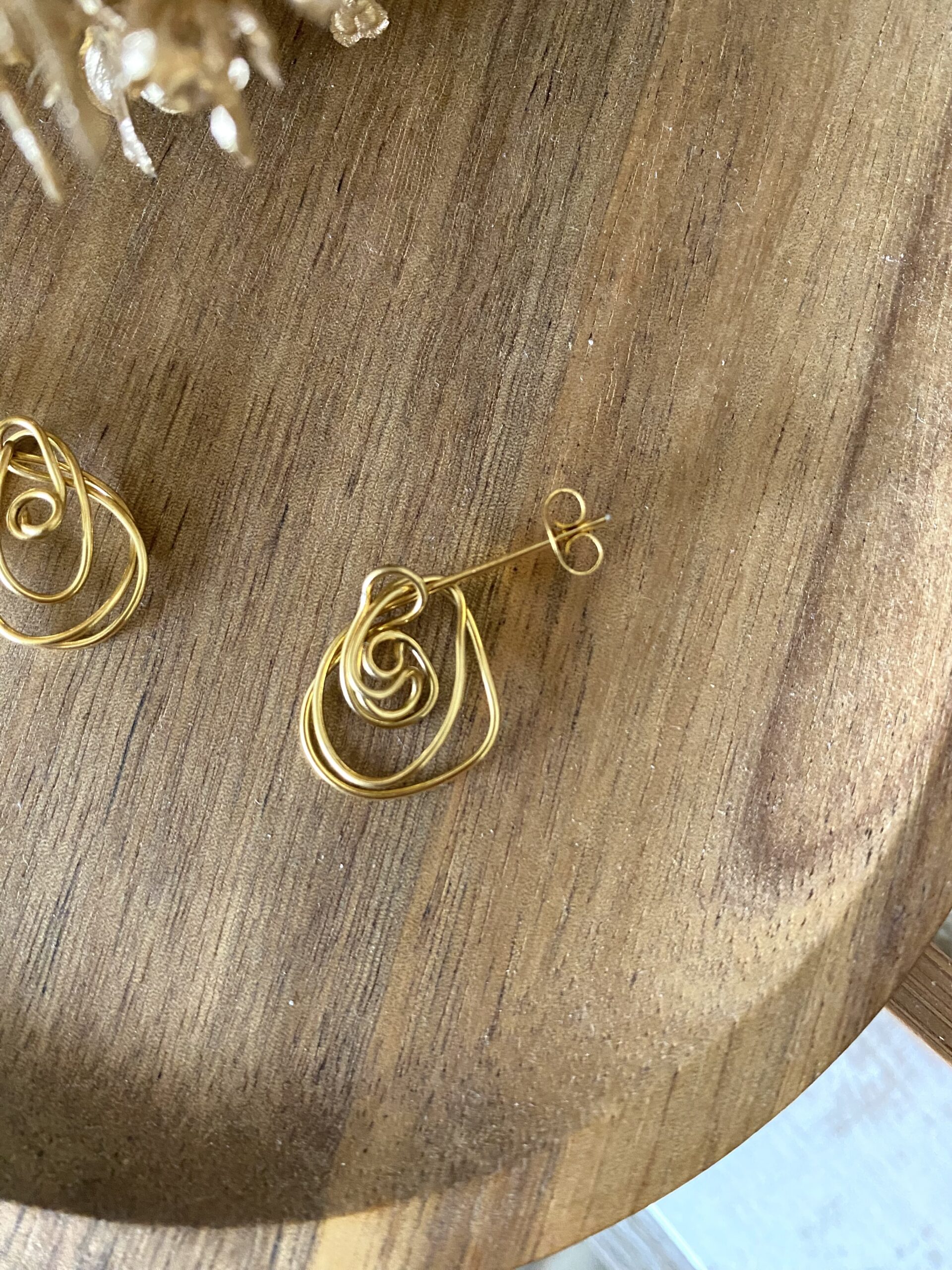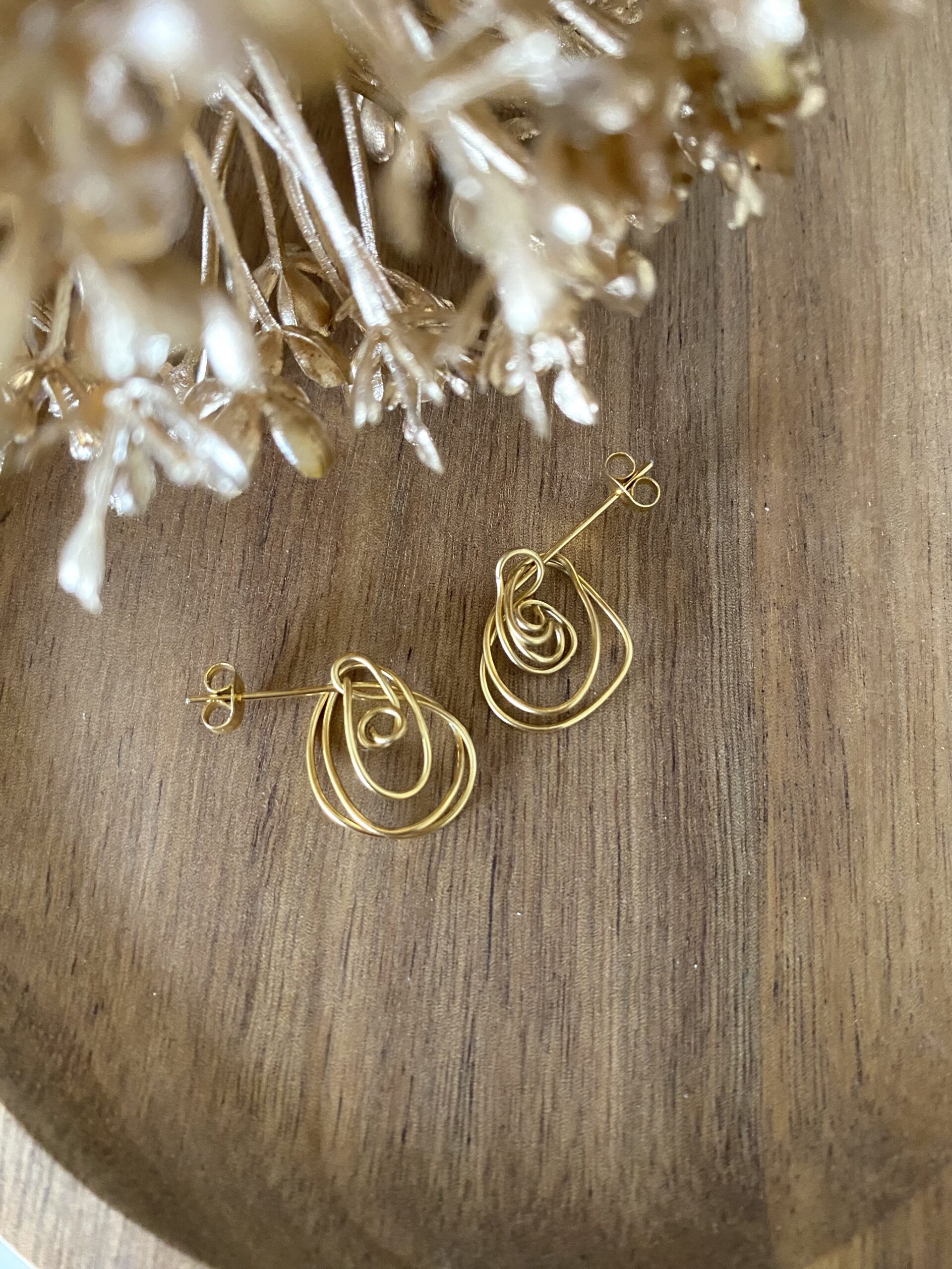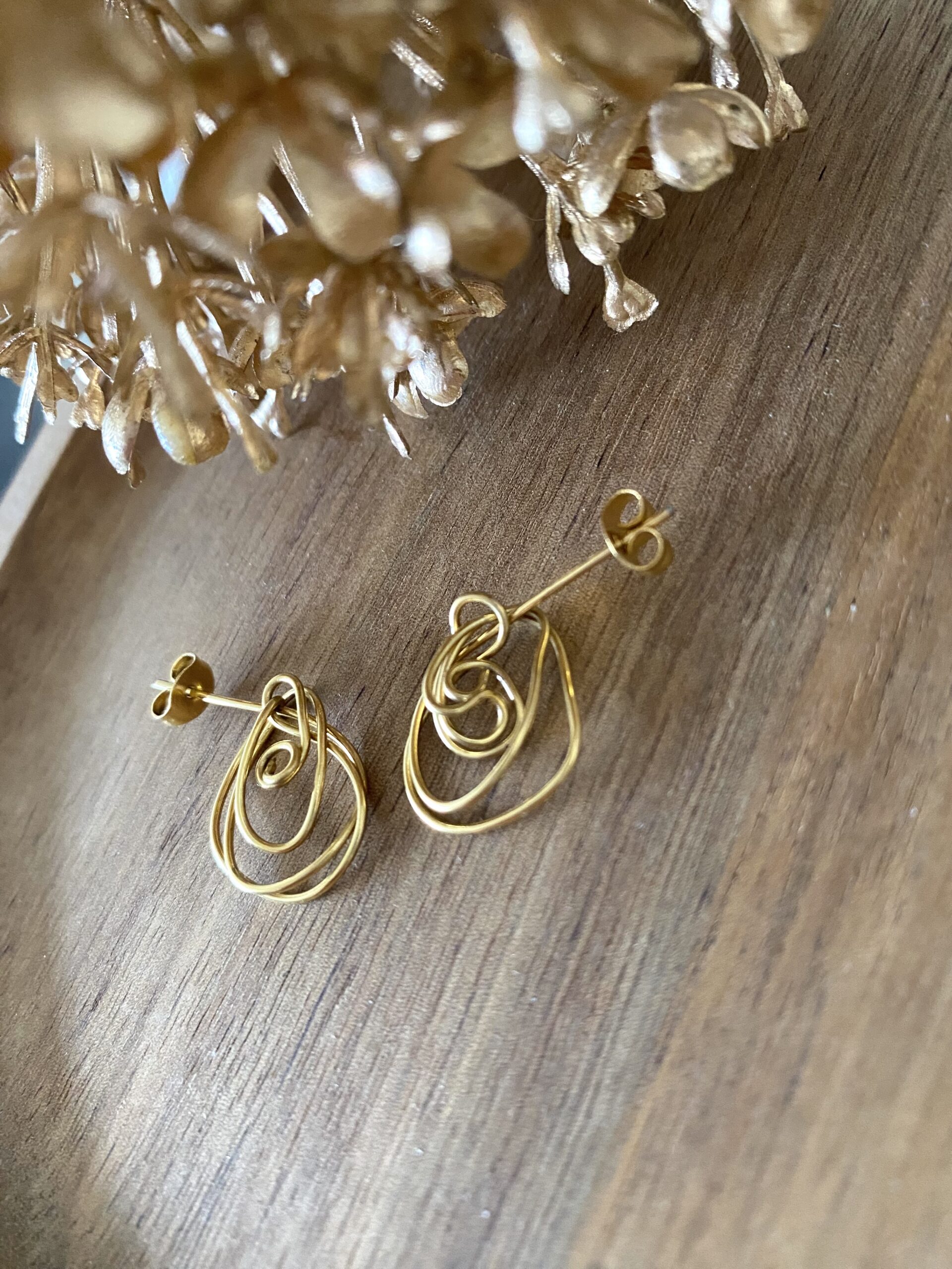 Des boucles d’oreilles en acier inoxydable doré, entièrement confectionnées à la main, composées de volutes entrelacées.