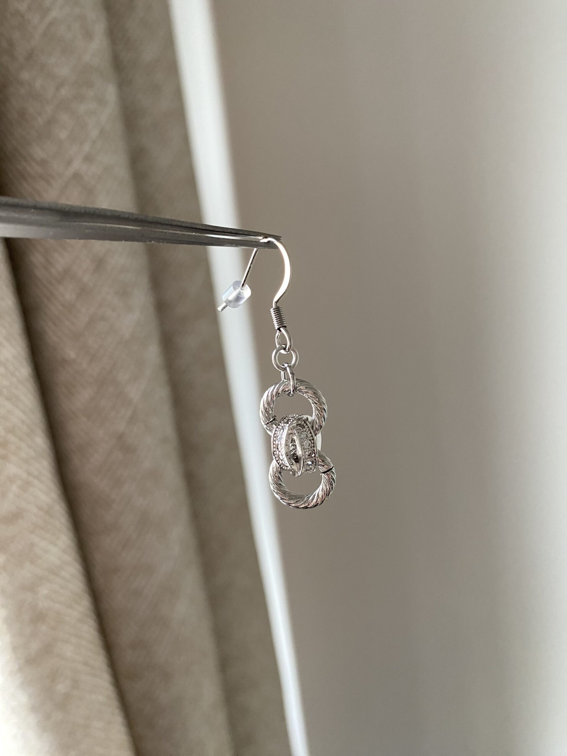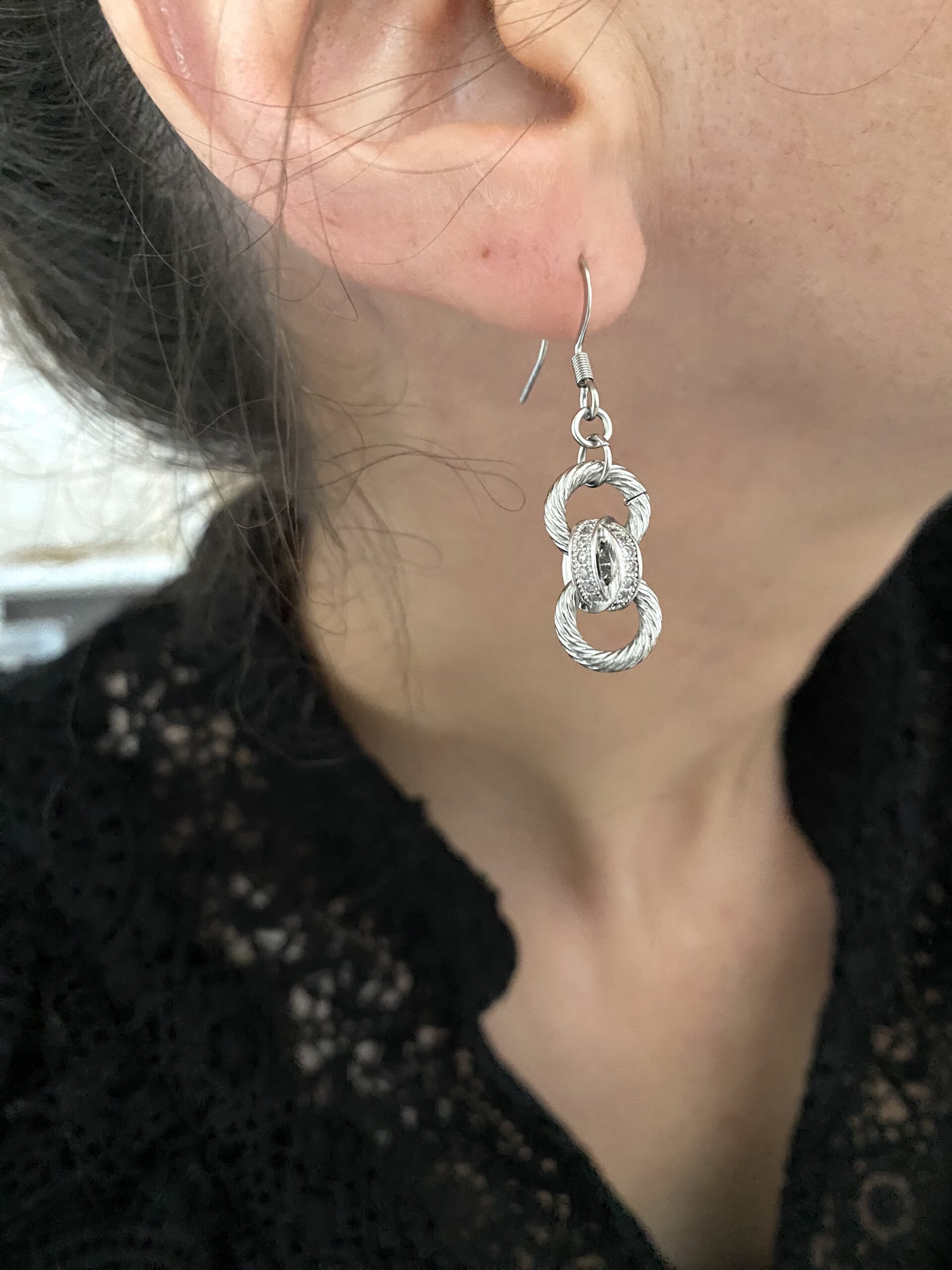 Des boucles d’oreilles en acier inoxydable, créées à la main, composées d’anneaux striés et enlacés à une perle ajourée en laiton rhodié, sertie de zirconiums.
