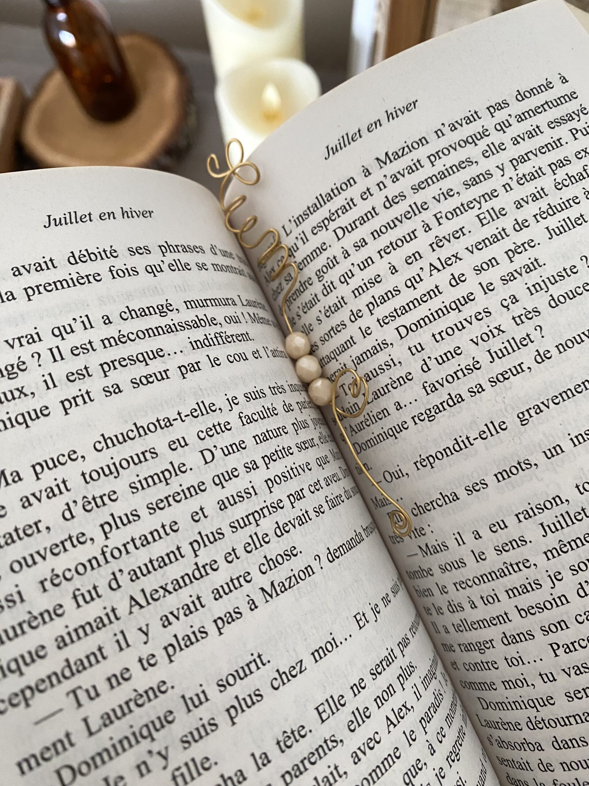 La longueur totale du marque-pages est de 10 cm environ. Le diamètre de chaque perle est de 6 mm.