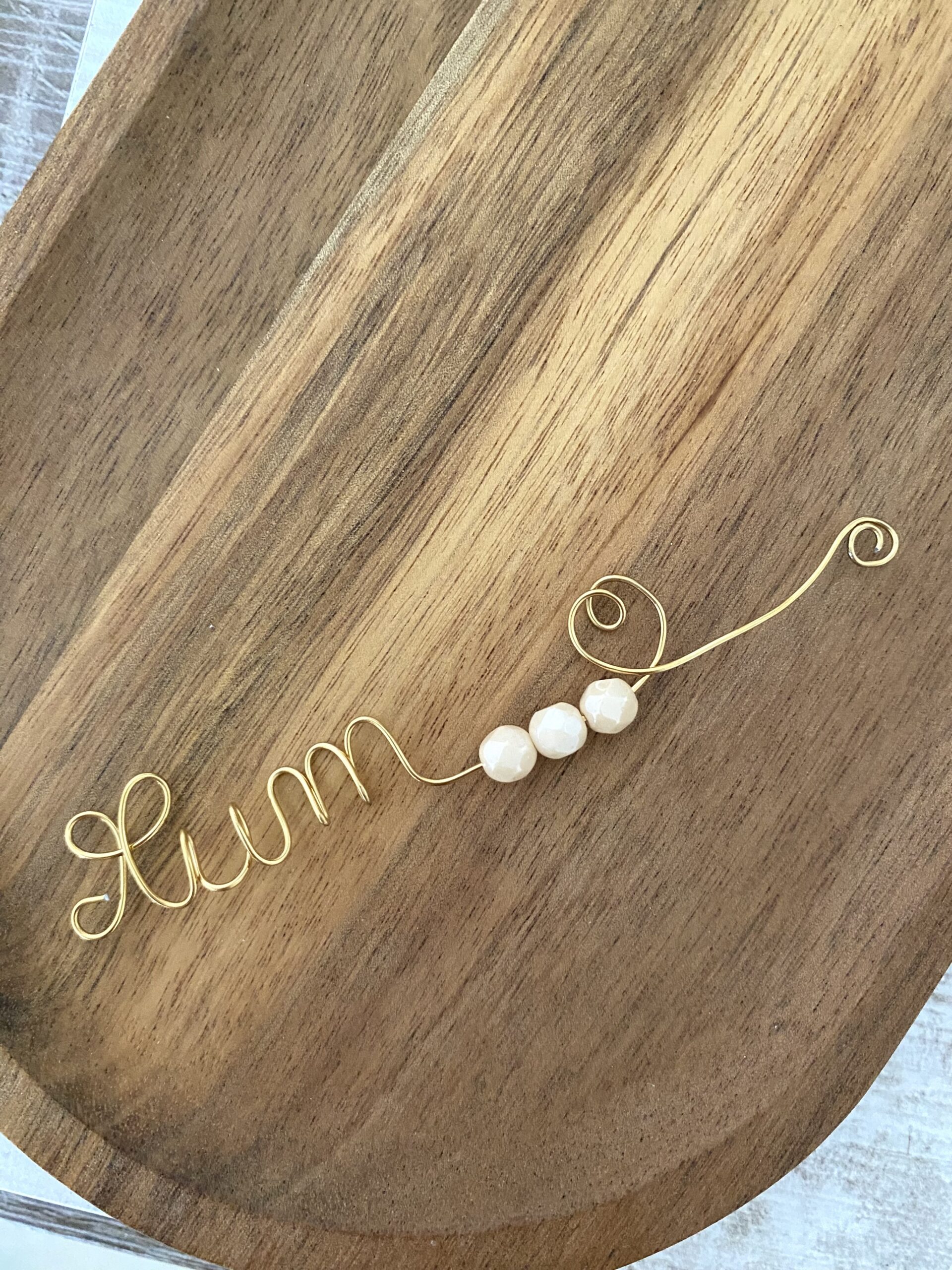 Un marque-pages bijoux en acier inoxydable doré, entièrement confectionné à la main, composé d’un fil travaillé écrit « Mum » accompagné d’un cœur et de perles facettées en verre de Bohême.