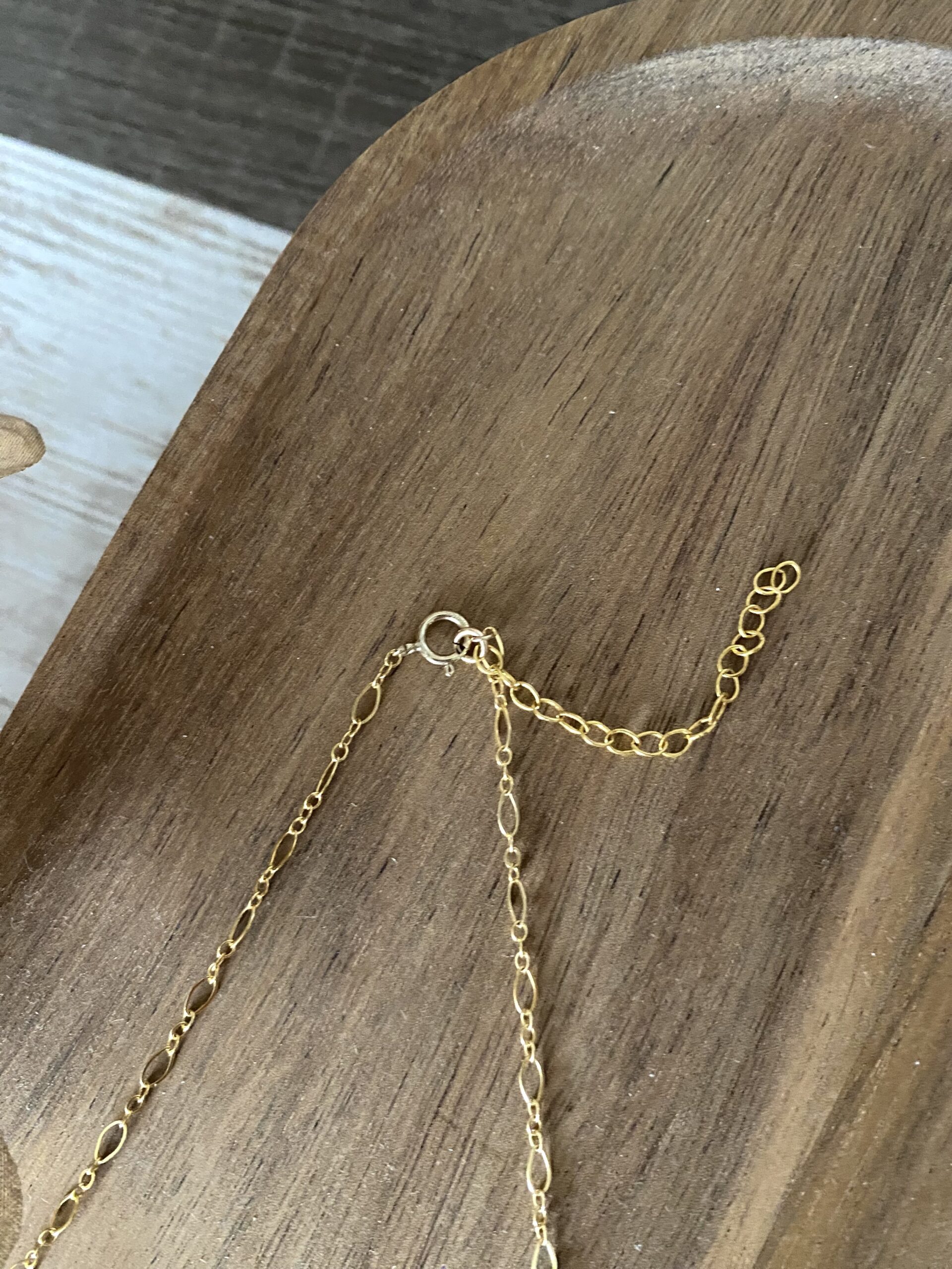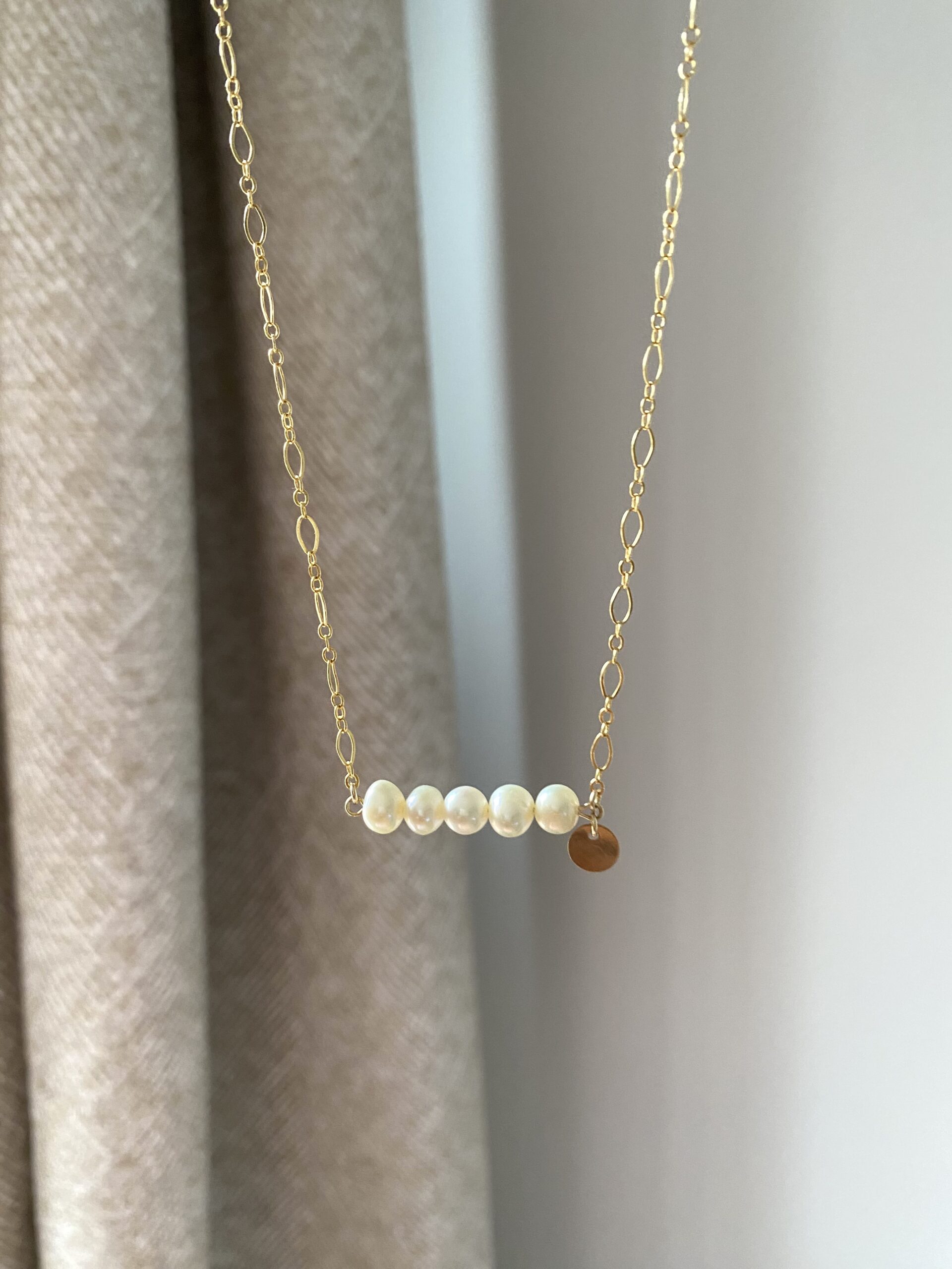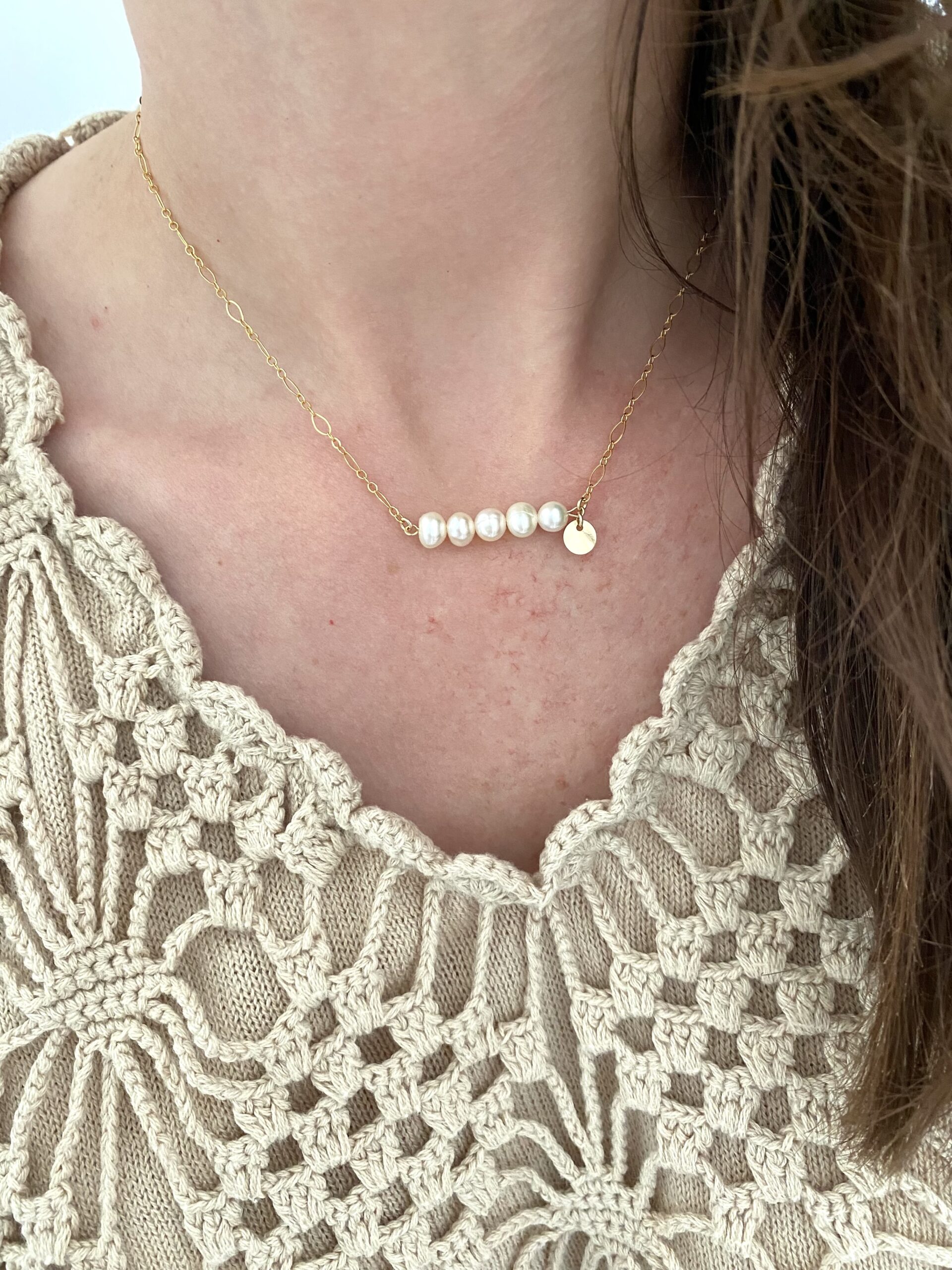 Un collier en or laminé (finition or 14 carats sur une base en laiton), entièrement réalisé à la main, composé de perles d’eau douce et d’un sequin.