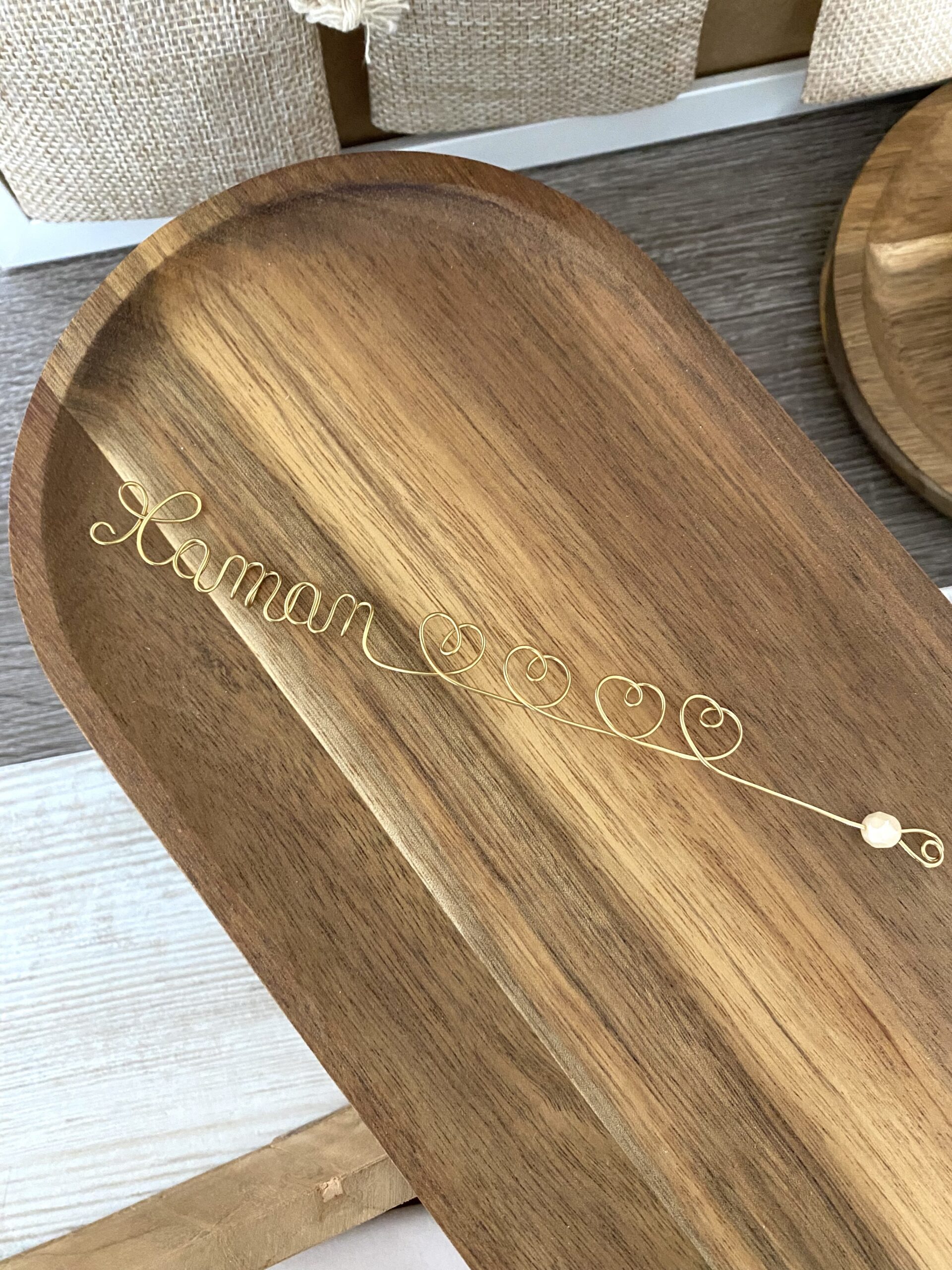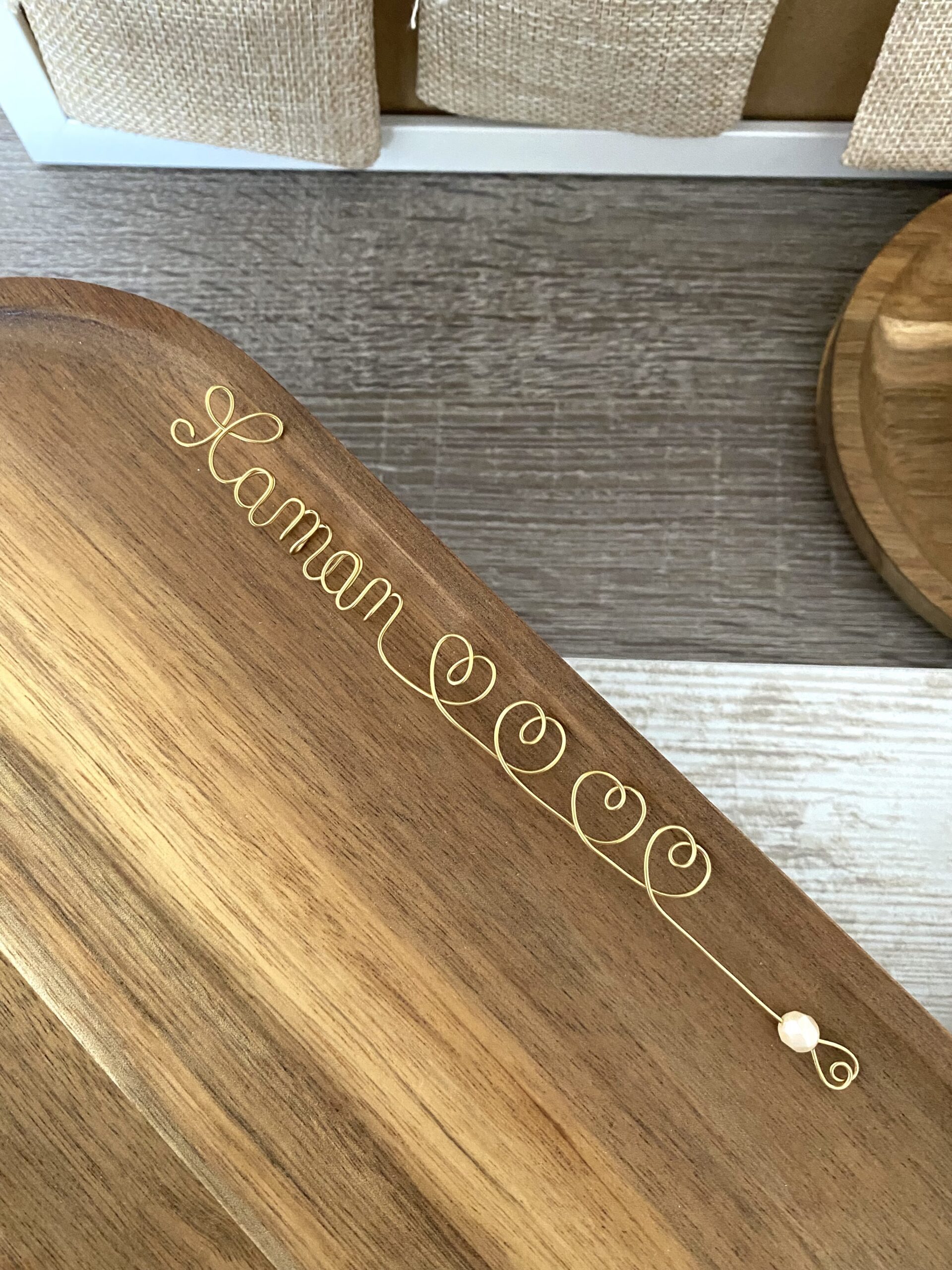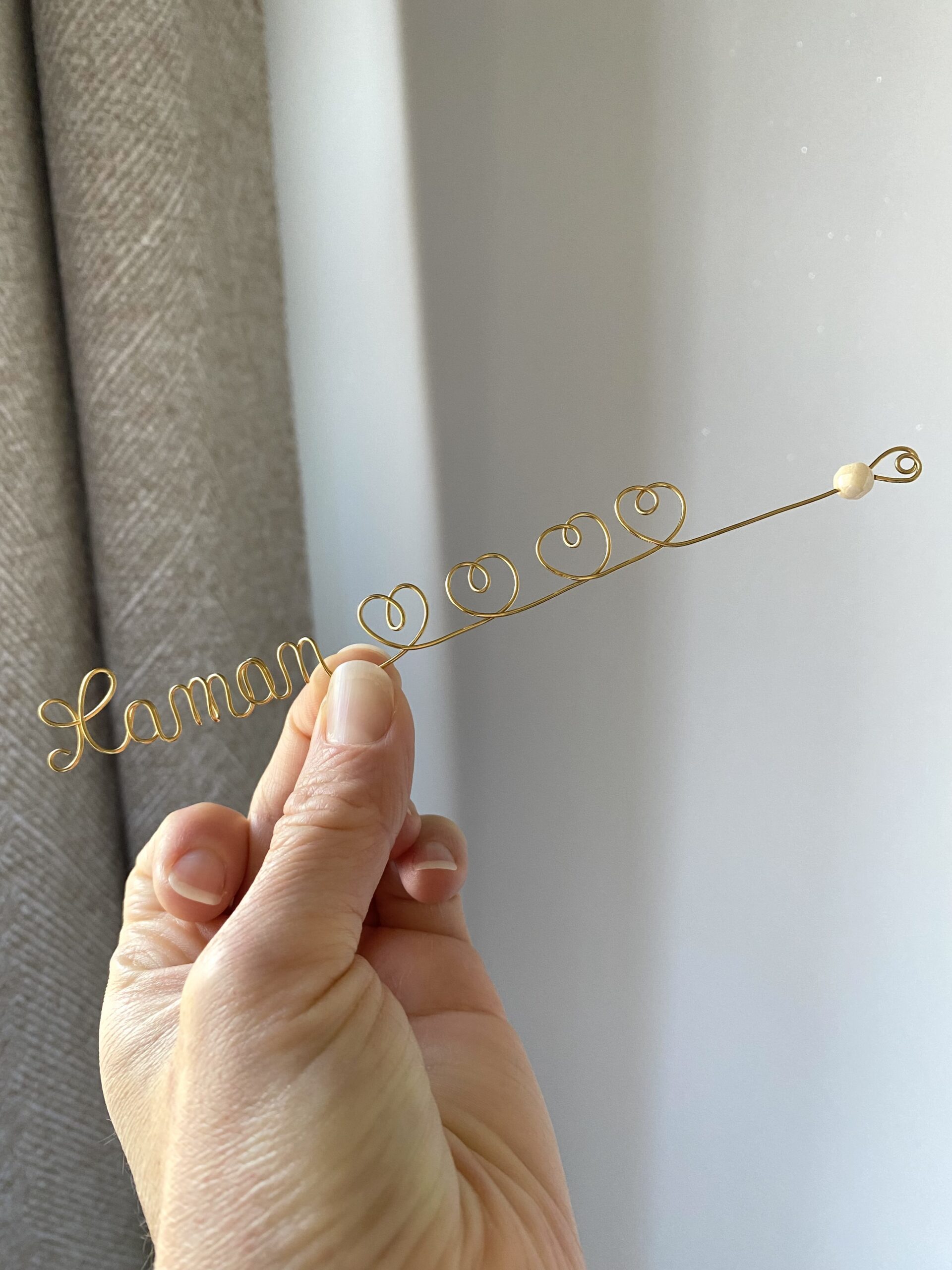 Un marque-pages bijoux en acier inoxydable doré, entièrement confectionné à la main, composé d’un fil où est écrit « Maman » avec un ou plusieurs cœurs, accompagnés d’une perle nacrée facettée en verre de Bohême*. Un petit cœur vient fermer et sublimer le bijou.